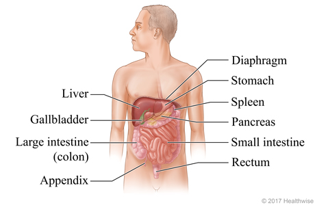 The major organs in the abdomen (belly) include the liver, gallbladder, large intestine (colon), stomach, spleen, pancreas, small intestine, and rectum. The diaphragm separates the abdominal cavity from the chest cavity. The appendix is also found in the abdomen. It's attached to the large intestine.